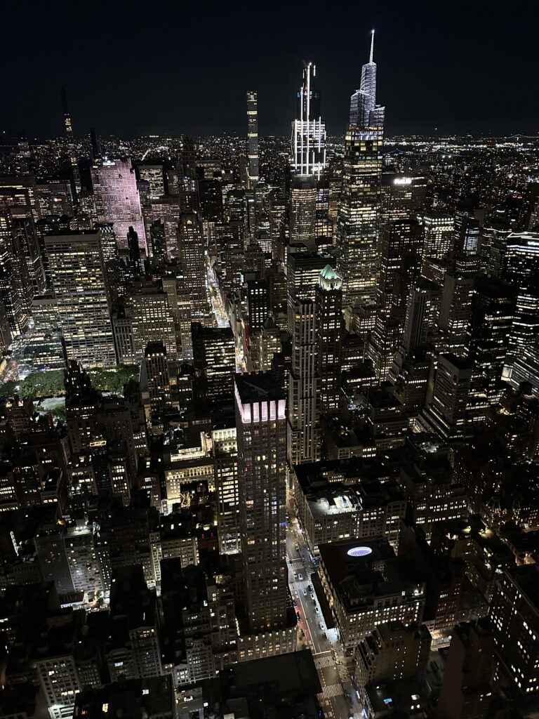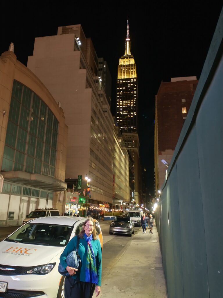 Hoped back onto the subway and headed to Penn Station where we exited the subway and walked to the Empire State Building. We had tickets to go to the 86th floor. There were no crowds and we skipped all the displays and went right up to the 80th floor; took some pictures which didn’t turn out too well because of the glare of the glass. Then up to the 86th floor where we had much better pictures because it was open air observation deck with no glass. I was happy there were bars to prevent folks from falling.