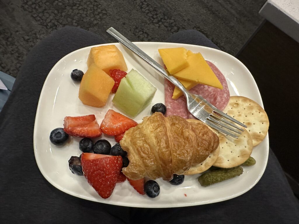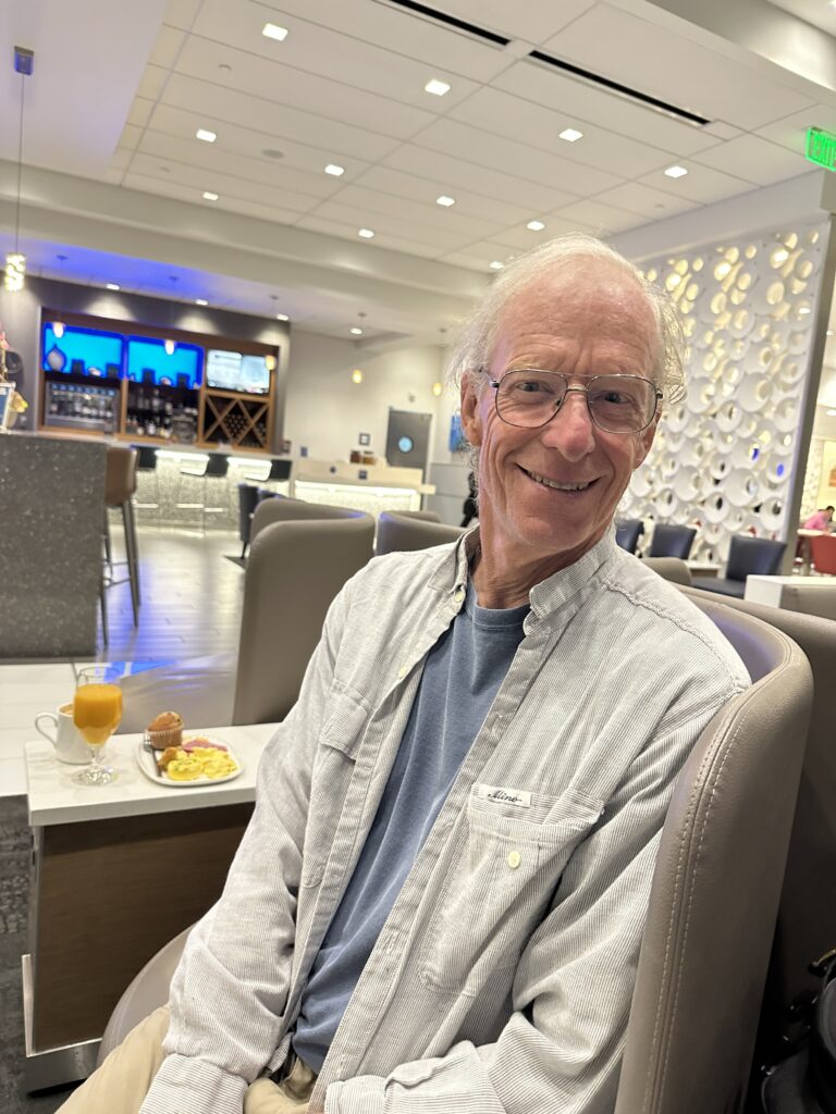 Finished packing, in bed by midnight and we left home 4am. Easy drive to San Francisco Airport; smooth check in and bag drop. And we were surprised and happy to discover the Delta lounge opened at 4:30am and we had the correct credentials and flight type to be allowed entry. Tasty little treat for breakfast. Boarded plane and left a few minutes after expected time.