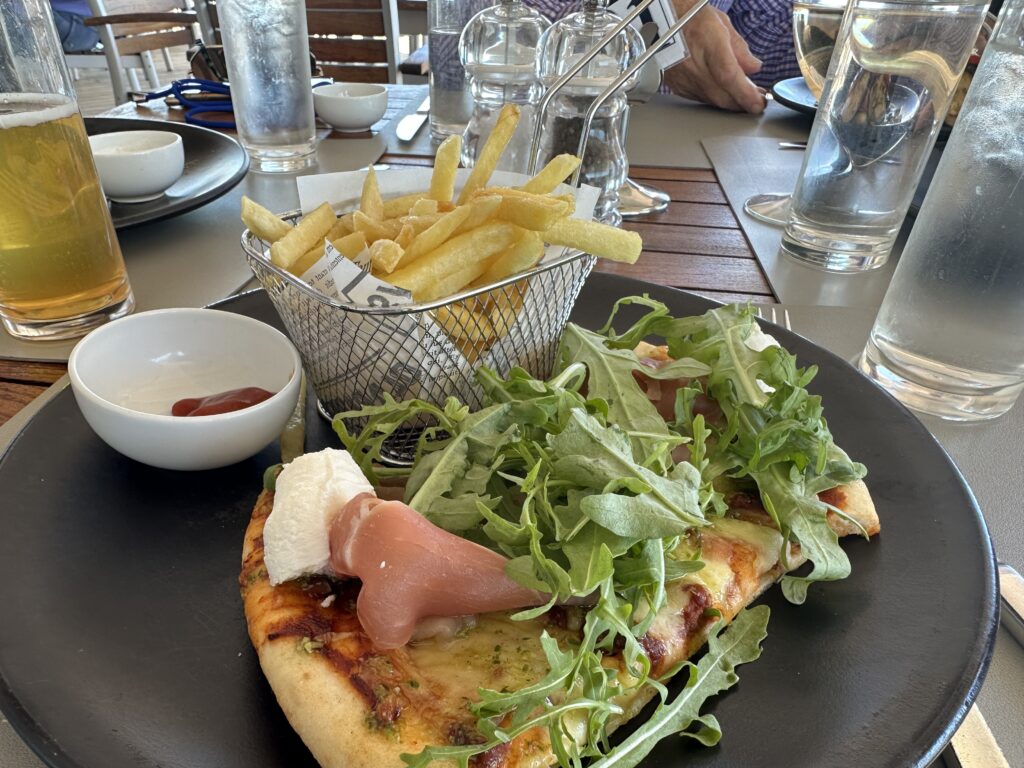 After the landing we headed back to the ship and had lunch at the Bistro. It wasn’t my favorite meal. It was supposed to be pizza but it had all sorts of fancy stuff on it. Dessert was tasty.