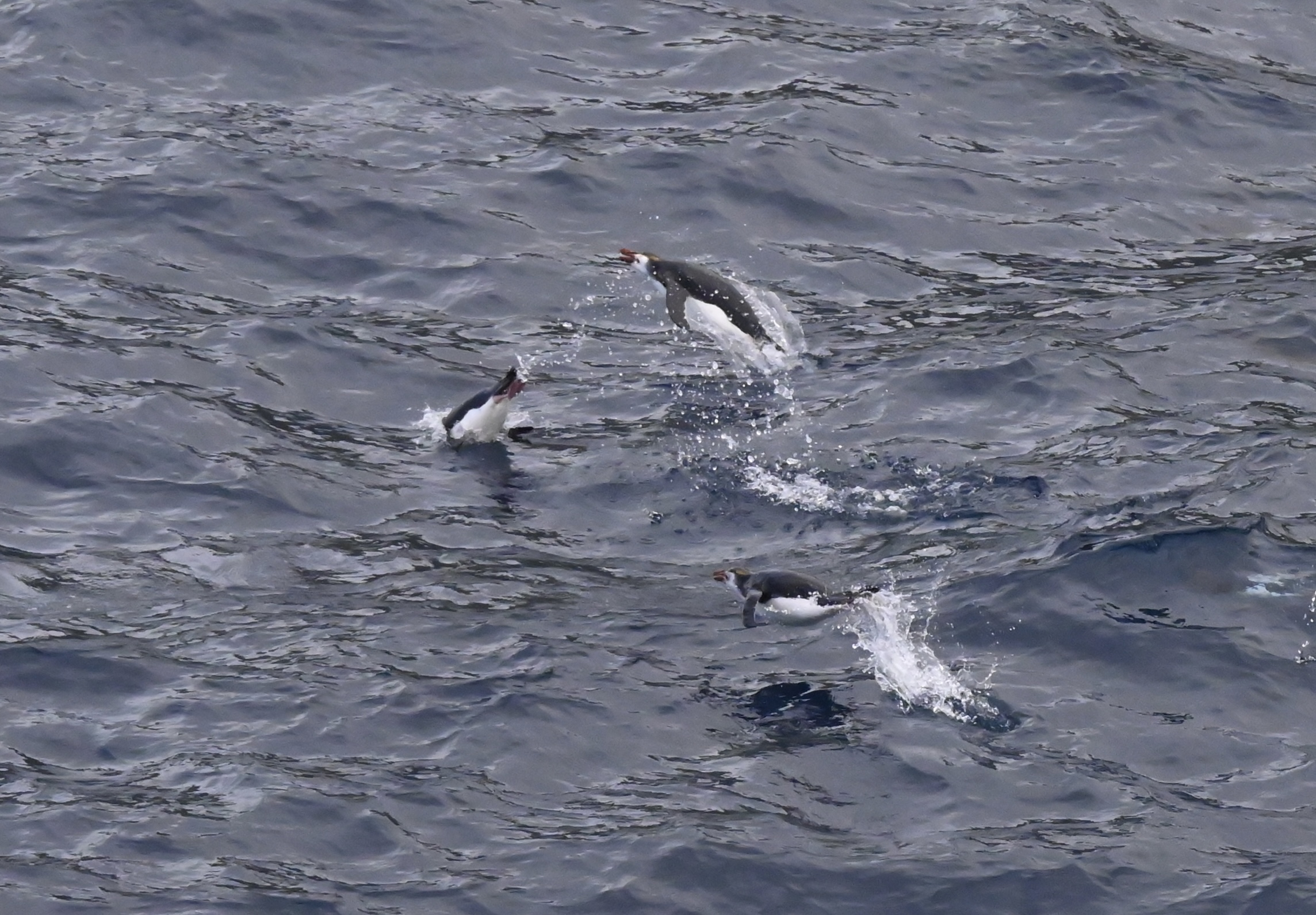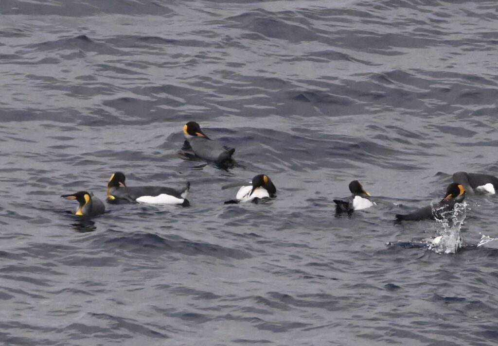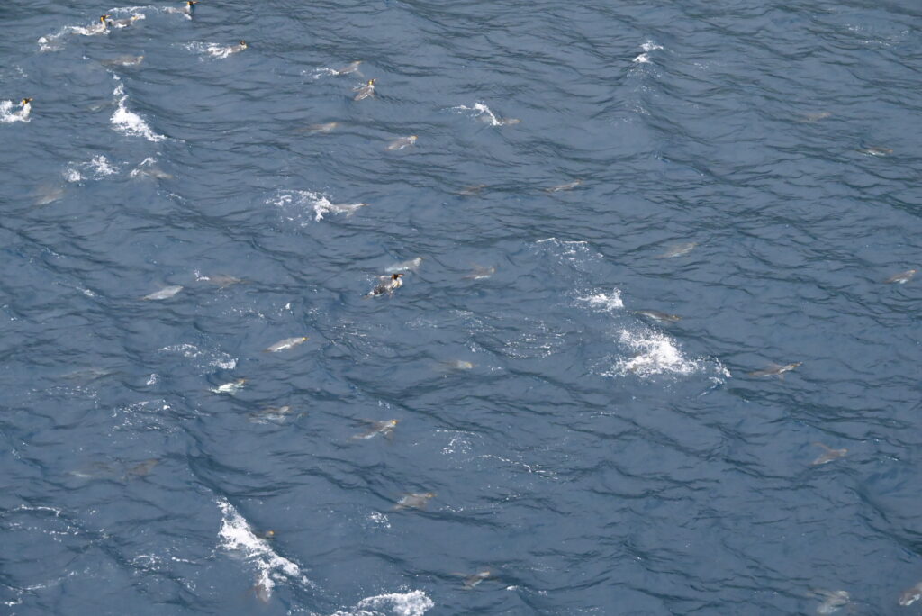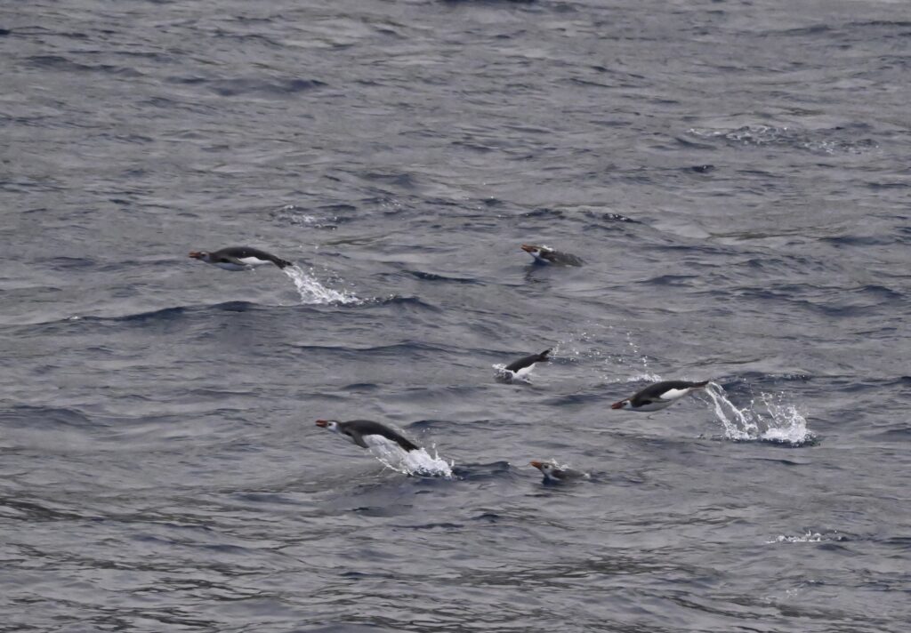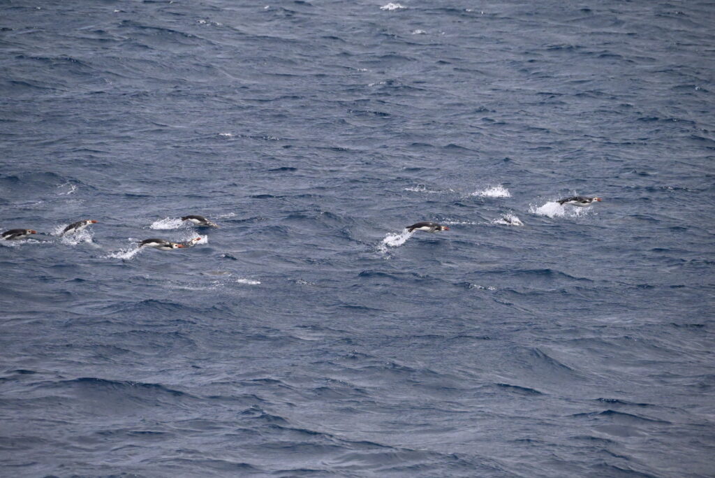 Views and swimming/porpoising penguins on the ship cruise: