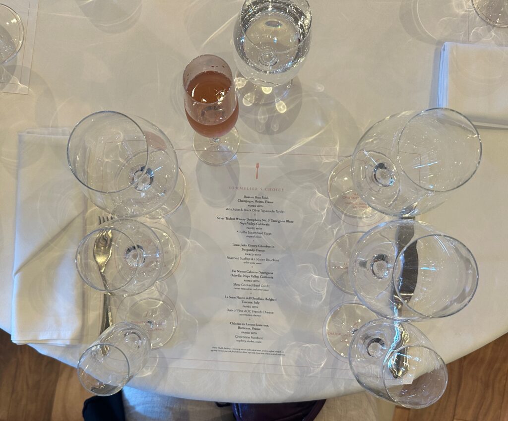 Nothing much happened on our sea day today other than a wonderful wine event. We purchased the “Sommelier’s choice wine tasting lunch”. We had 6 courses and each had a special wine paired with it plus a welcome glass of sparkling wine. We were pretty full when we were finished.