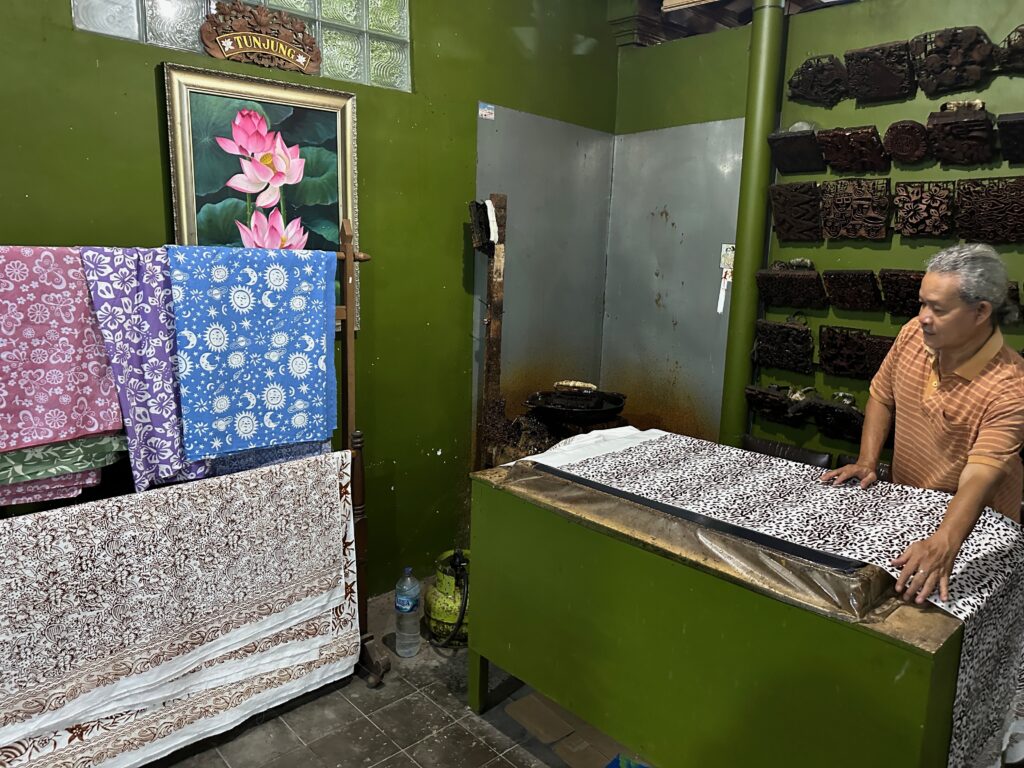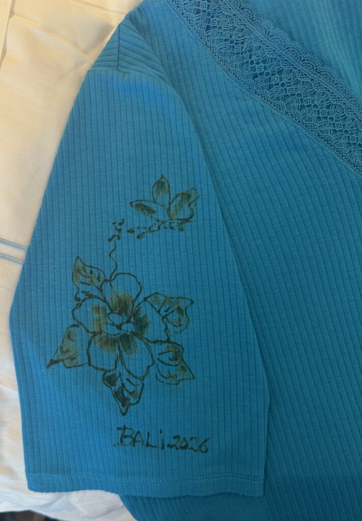 At the batik shop, they drew the flower on my shirt with wax- it ‘should’ just wash off