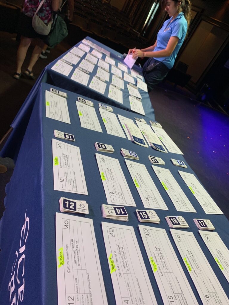 There are over 1100 people on board and most will take excursions. Destination services is in charge of these excursions. When you have a paid excursion, they give you a ticket with the meeting date & time. You turn in your ticket and get a small laminated bus/van number. When your bus/van number is called you leave the ship and walk to your bus/van which takes you on your excursion. Many of the islands stops on this cruise use small vans instead of large busses because the roads are narrow, steep & twisty therefore each excursion can use many(4 or more) vans. There are frequently multiple departures for any given excursion e.g a morning departure and an afternoon departure